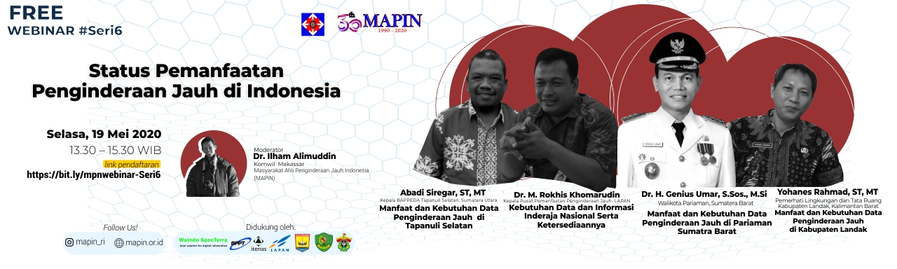 MAPIN kembali hadir dengan Webinar #6 dengan topik Status Pemanfaatan Penginderaan Jauh di Indonesia yang membahas info terkini terkait pemanfaatan penginderaan jauh dari LAPAN beberapa pemerintah daerah dan praktisi sebagai pengguna.